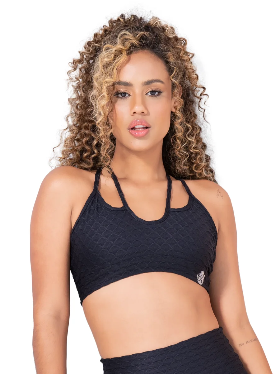 Top realce de busto media luna delantera con escote posterior entrecruzado de tiras.