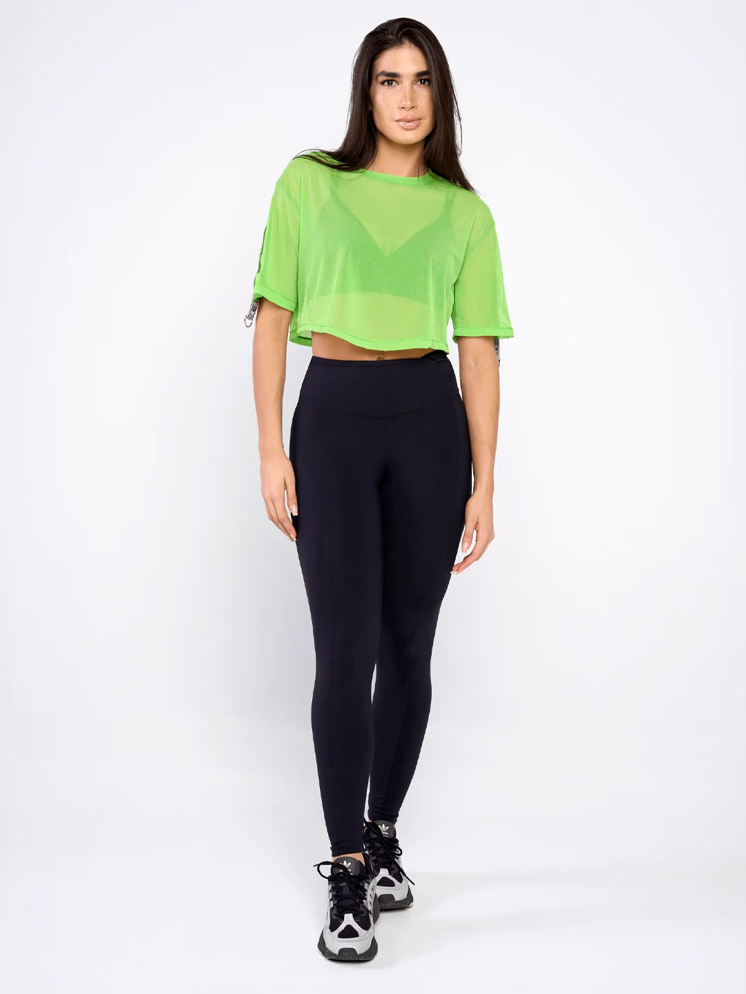 T-shirt oversize en malla con detalle de elástico jacquard Bonlife y herraje de acero inoxidable. Tela de transparencia, filtro uv y suave al tacto