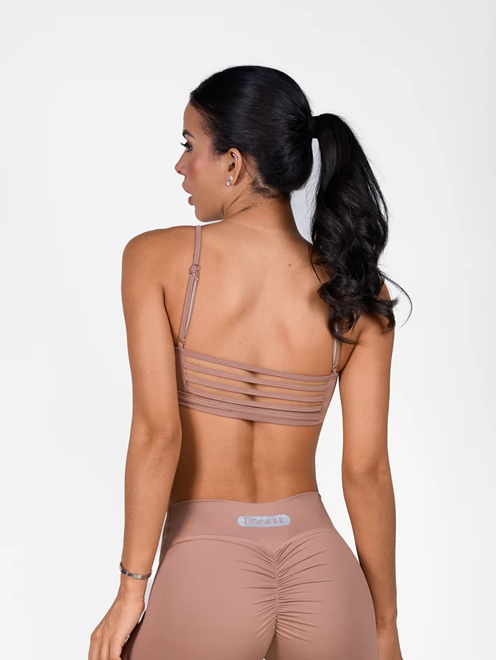 Top realce de busto con detalle de trabillas posteriores para un look moderno y vestidor, herrajes de acero inoxidable. Tela con tecnología Xdry, de tacto suave y máxima elongación. Aplique reflectivo.