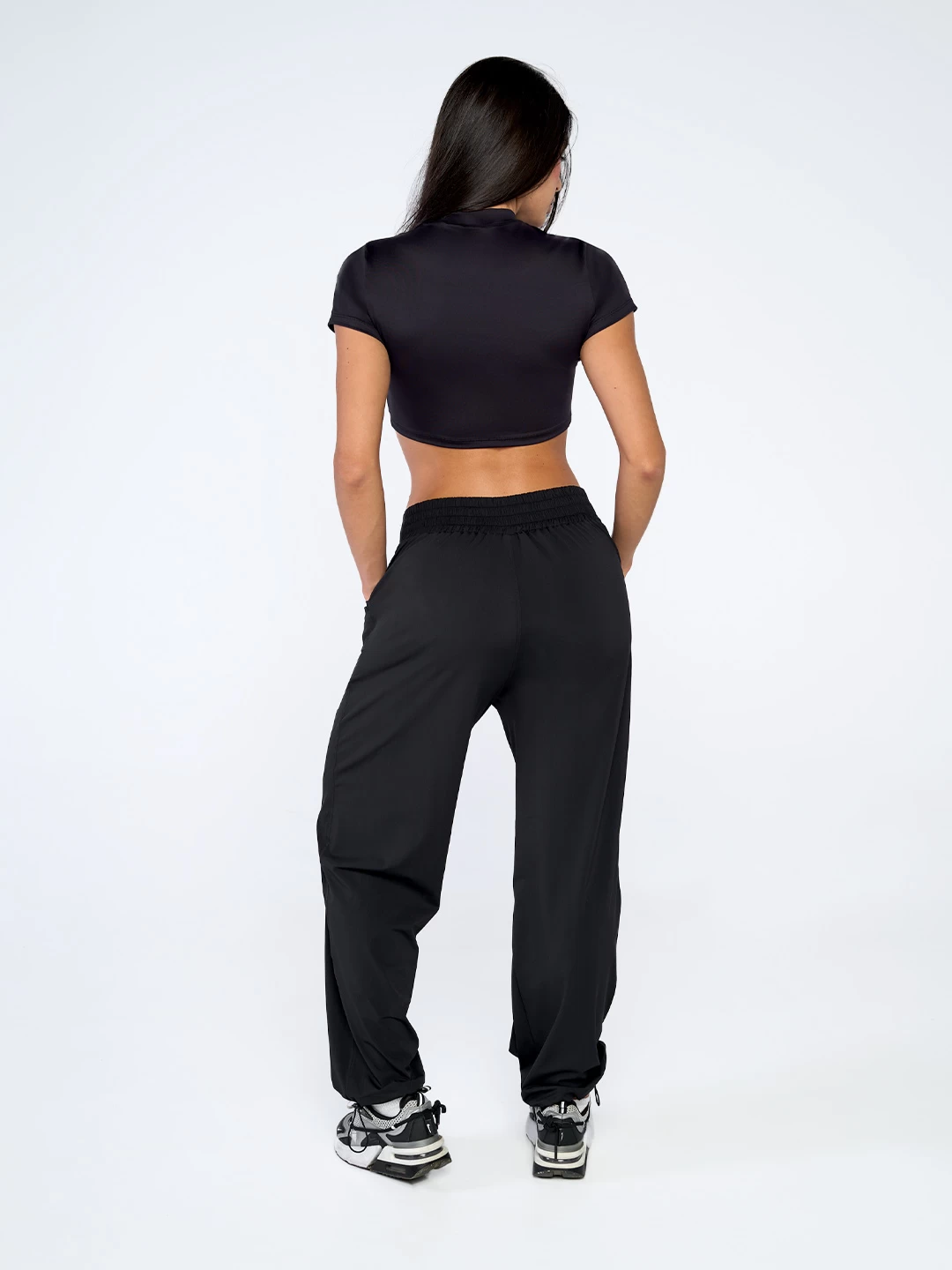 Blusa de manga corta con cuello alto y silueta ajustada, perfecta para un look urbano que resalta tu figura con estilo. Su tejido elástico de tacto suave brinda comodidad durante todo el día, mientras que el aplique reflectante añade un detalle moderno y funcional.