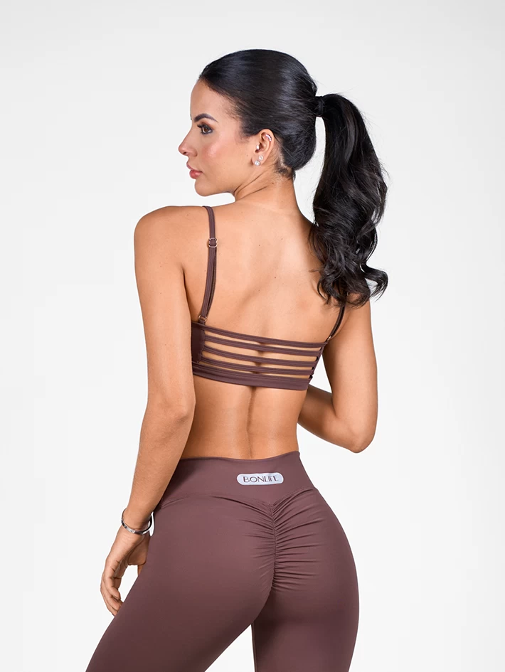 Top realce de busto con detalle de trabillas posteriores para un look moderno y vestidor, herrajes de acero inoxidable. Tela con tecnología Xdry, de tacto suave y máxima elongación. Aplique reflectivo.