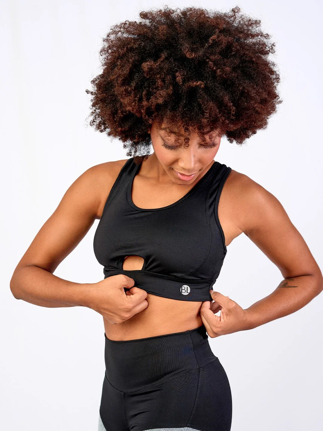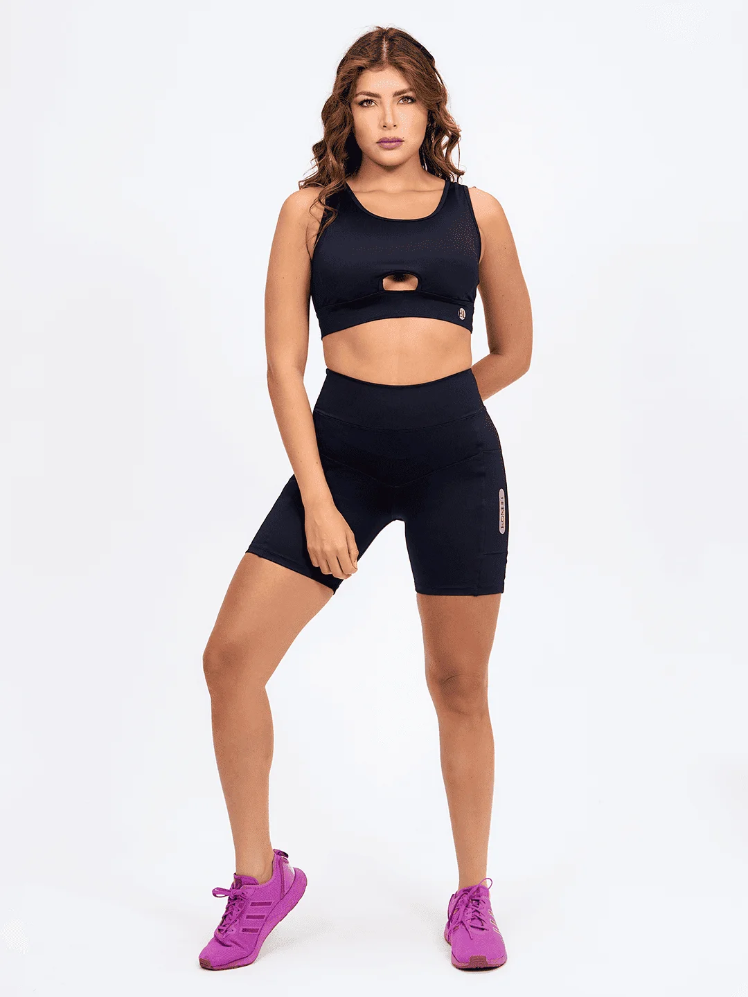 El Top Ocaso presenta un escote redondo y un ajuste perfecto, con cortes combinados y detalles de vivos en contraste.
