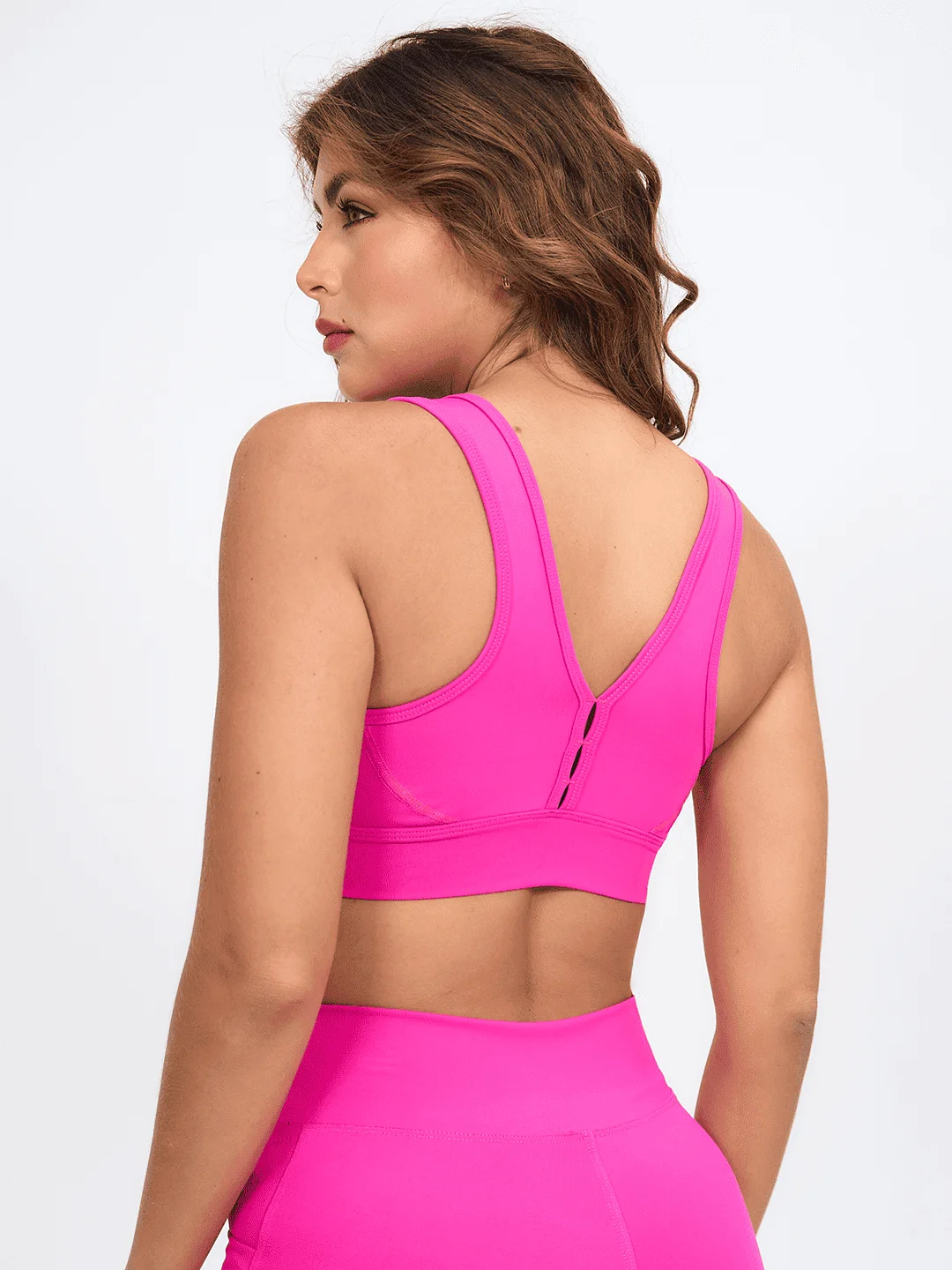 El Top Ocaso presenta un escote redondo y un ajuste perfecto, con cortes combinados y detalles de vivos en contraste.
