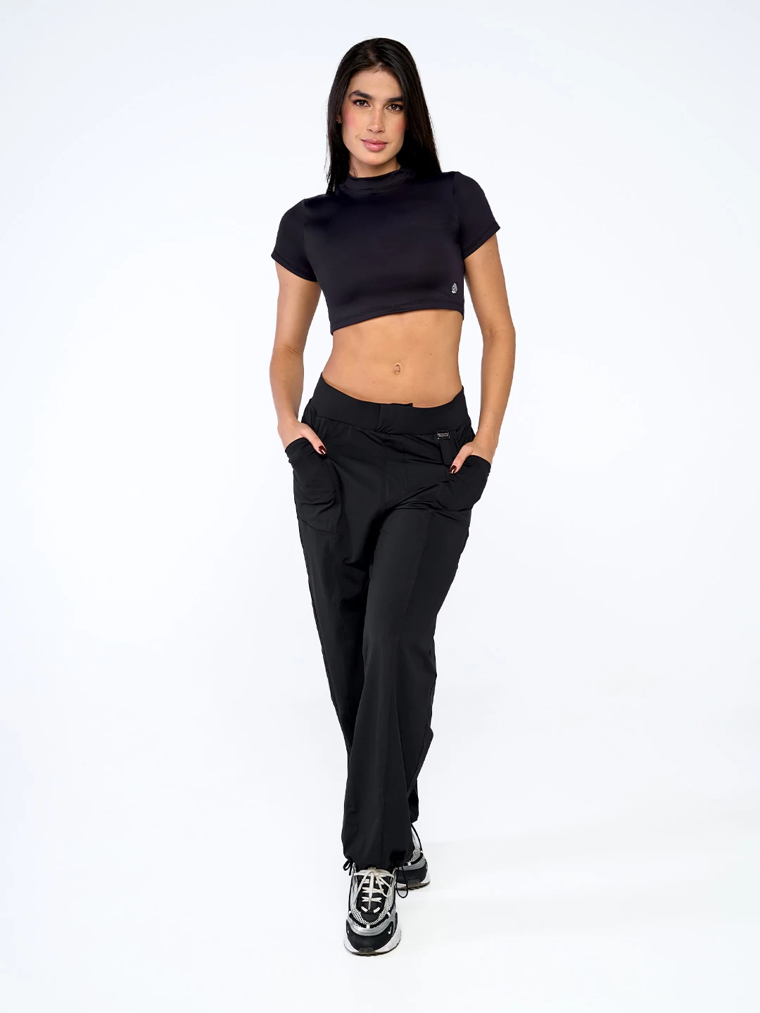 Blusa de manga corta con cuello alto y silueta ajustada, perfecta para un look urbano que resalta tu figura con estilo. Su tejido elástico de tacto suave brinda comodidad durante todo el día, mientras que el aplique reflectante añade un detalle moderno y funcional.
